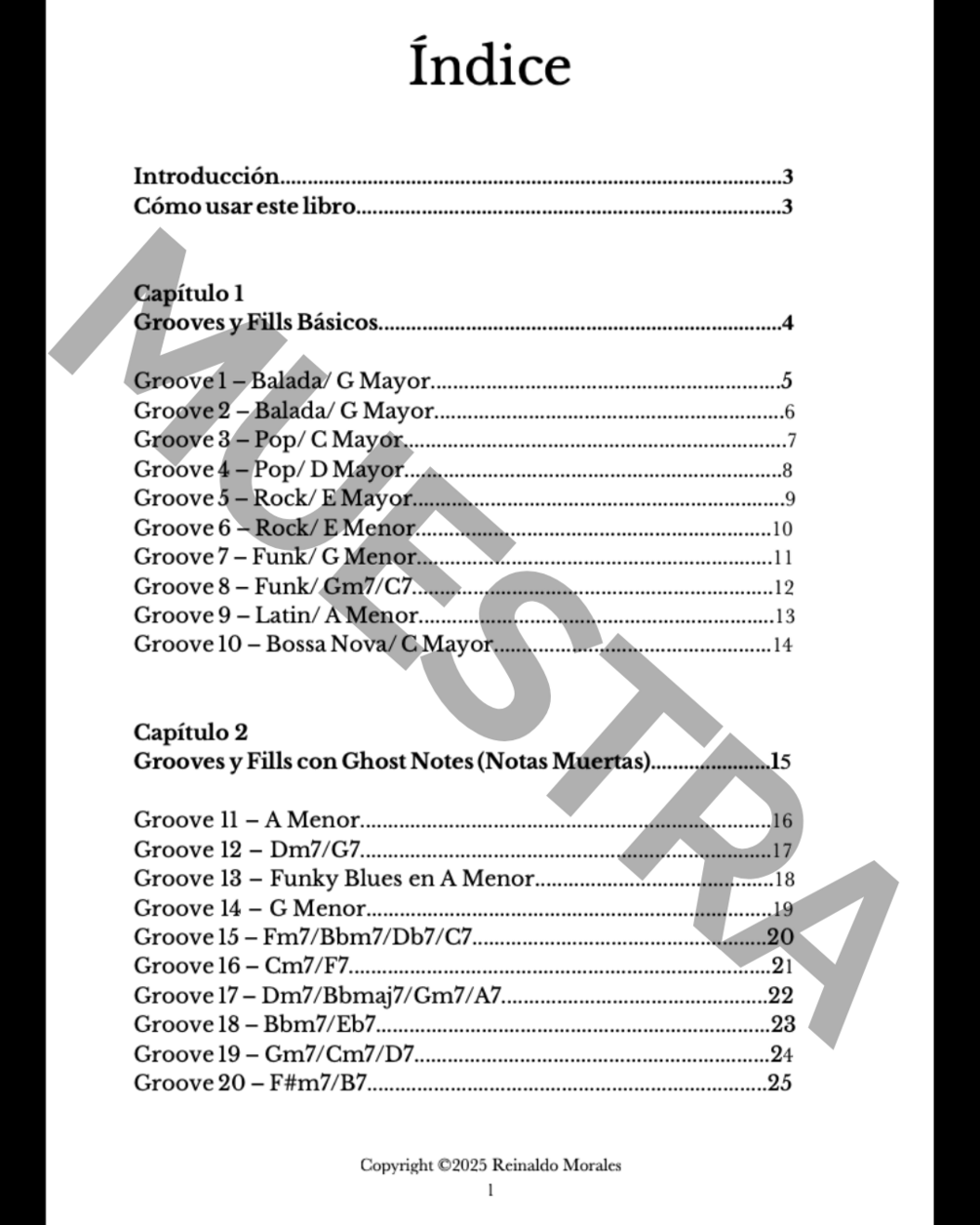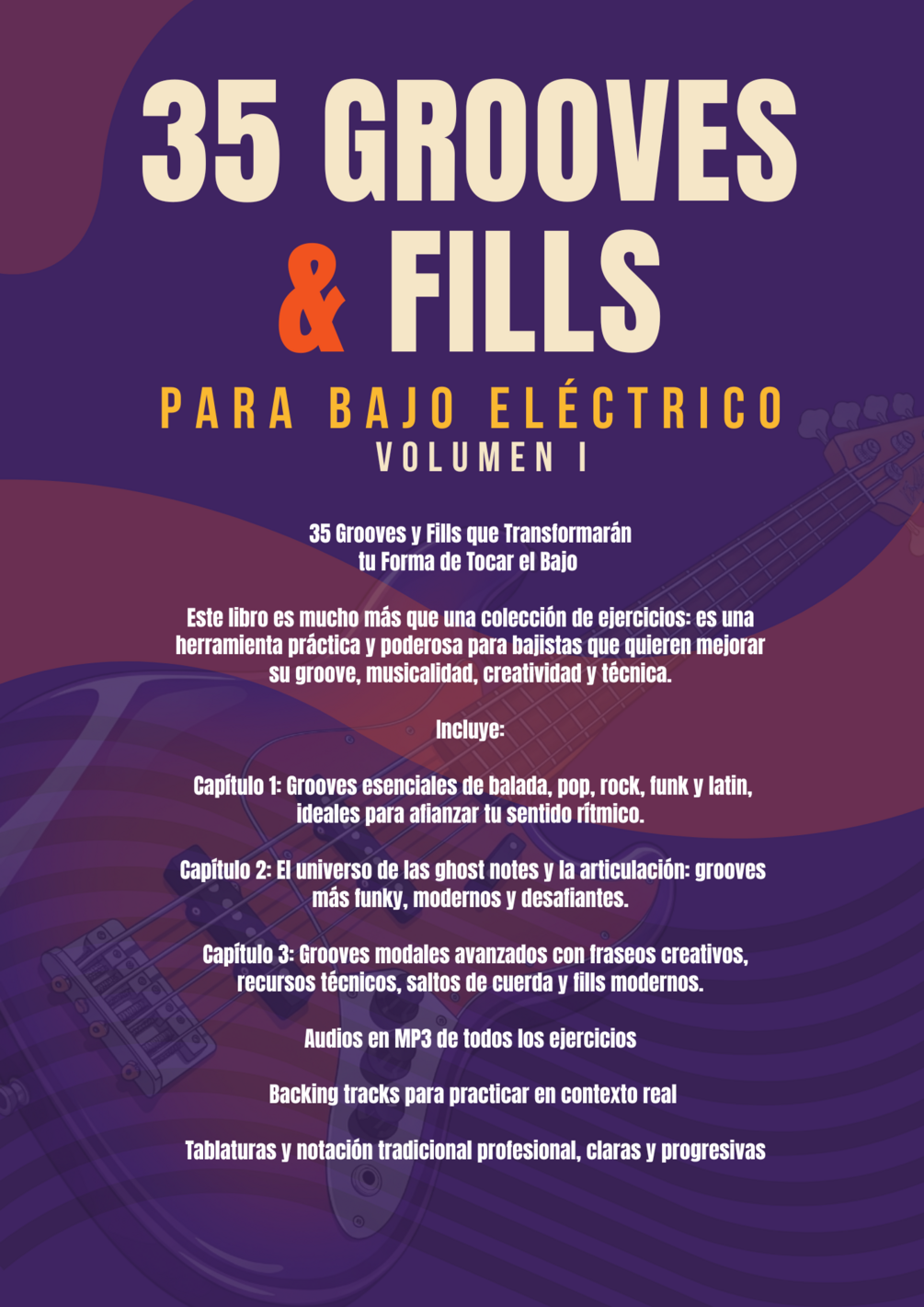 ¿QUÉ INCLUYE ESTE LIBRO? PDF completo con 44 páginas 35 Grooves + 35 Fills escritos en partitura y tablatura 35 Backing Tracks de calidad profesional 35 audios de ejemplo en MP3 Ejercicios progresivos que desarrollan tu fraseo, rítmica y articulación Ideal para bajistas que buscan mejorar en el groove, sonar con más flow y precisión